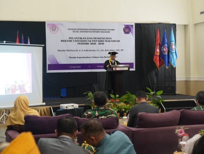 Dalam prosesi tersebut, Marsma TNI (Purn) Dr. Ir. Andi Sutomo, S.T., S.H., M.Si. (Han)., CEH., IPP., resmi dikukuhkan sebagai Rektor Universitas PEPABRI Makassar untuk periode 2026–2030. Pelantikan ini menjadi momentum penting dalam memperkuat peran institusi pendidikan yang berada di bawah naungan PEPABRI dalam mencetak sumber daya manusia unggul, berkarakter, serta memiliki semangat pengabdian kepada bangsa dan negara.