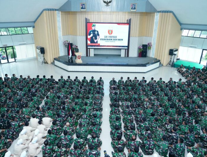 MEDIAWARTA,— Mengawali tahun 2026, Pangdam XIV/Hasanuddin Mayjen TNI Bangun Nawoko memberikan Jam Pimpinan kepada seluruh prajurit dan PNS di lingkungan Makodam XIV/Hasanuddin sebagai upaya memberikan motivasi serta memperkuat semangat pengabdian agar pelaksanaan tugas kedepan berjalan semakin optimal, dan profesional, yang dilaksanakan di Balai Pertemuan Hasanuddin (BPH), Jl. Urip Sumoharjo, Kota Makassar. Jumat (2/1/2026).