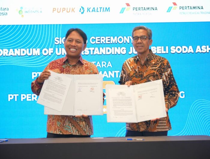 MEDIAWARTA,-PT Pupuk Kalimantan Timur (Pupuk Kaltim) dan PT Pertamina Petrochemical Trading resmi menandatangani Nota Kesepahaman (MoU) perjanjian jual-beli soda ash. Penandatanganan ini menjadi langkah awal kerja sama strategis antara kedua perusahaan dalam rencana jual-beli soda ash dari pabrik yang saat ini tengah dibangun Pupuk Kaltim.