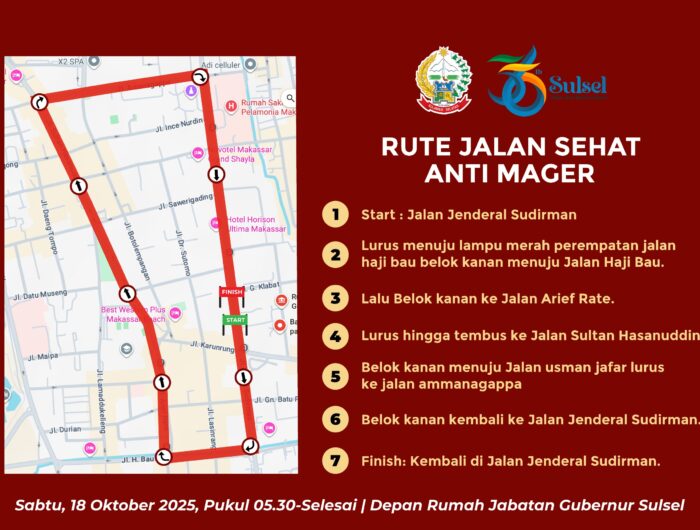 MEDIAWARTA,MAKASSAR — Pemerintah Provinsi Sulawesi Selatan kembali akan menggelar kegiatan Jalan Sehat Anti Mager (Malas Gerak) sebagai bagian dari rangkaian peringatan Hari Jadi Provinsi Sulawesi Selatan ke-356 tahun. Kegiatan ini dijadwalkan berlangsung pada Sabtu, 18 Oktober 2025, mulai pukul 05.30 WITA.