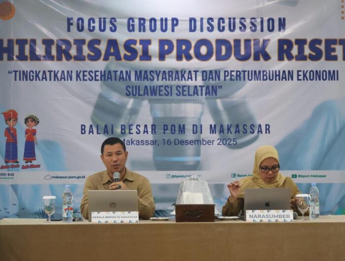 MEDIAWARTA,-Dalam rangka meningkatkan sinergi dan kolaborasi antara Academia, Business, dan Government (ABG) untuk mendorong hilirisasi riset, bertempat di aula Baji Minasa pada tanggal 16 Desember 2025 Balai Besar Pengawas Obat dan Makanan (BBPOM) di Makassar menyelenggarakan kegiatan Focus Group Discussion (FGD) ABG Collaboration dengan tema “Hilirisasi Riset untuk Kesehatan Masyarakat dan Pertumbuhan Ekonomi di Sulawesi Selatan. Kegiatan dihadiri oleh sekitar 86 peserta yang berasal dari perguruan tinggi, lembaga penelitian, pemerintah dan pelaku usaha.